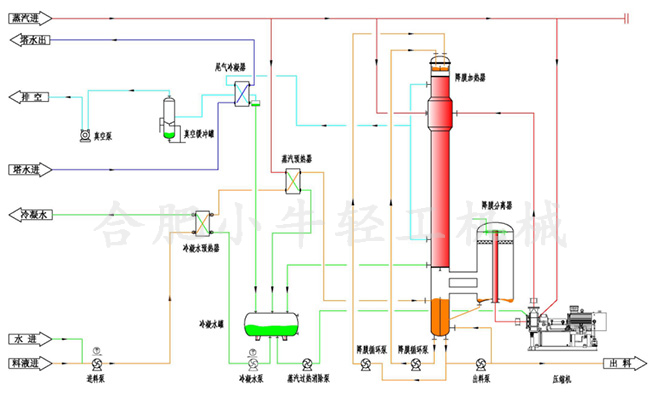 降膜蒸發(fā)器的料液是從蒸發(fā)器的頂部加入,在重力作用下沿管壁成膜狀下降,并在通過加熱管的過程中被蒸發(fā)增濃,在其底部得到濃縮液。MVR降膜蒸發(fā)器將加熱器的產(chǎn)生的二次蒸汽通過壓縮機(jī)的絕熱壓縮,能量進(jìn)行壓縮提升,使其壓力、溫度提高后,再作為加熱蒸汽送入蒸發(fā)器的加熱室,冷凝放熱,使其對這壓縮過后的二次蒸汽加以利用,將其二次蒸汽內(nèi)部潛熱進(jìn)行回收。因二次蒸汽的潛熱得到了回收利用,所以該設(shè)備具有節(jié)省能耗的顯著特點(diǎn)。